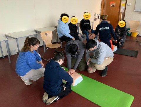 Im Mittelpunkt des Trainings standen lebensrettende Maßnahmen, die im Ernstfall entscheidend sein können. Im Klassenzimmer übten die Schülerinnen und Schüler an speziellen Übungsdummies die Herz-Rhythmus-Massage sowie die stabile Seitenlage. Dabei wurde nicht nur erklärt, sondern vor allem praktisch gearbeitet, sodass alle Teilnehmenden selbst aktiv werden konnten.